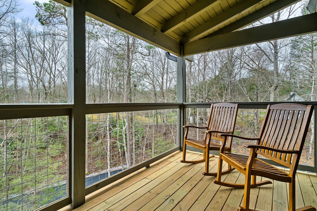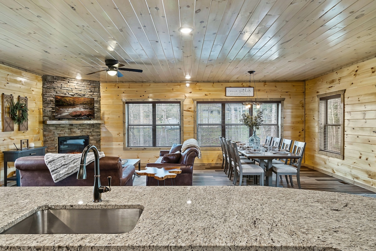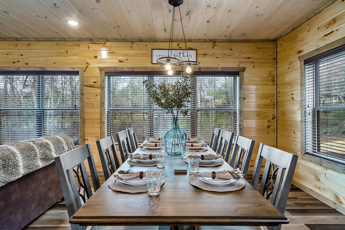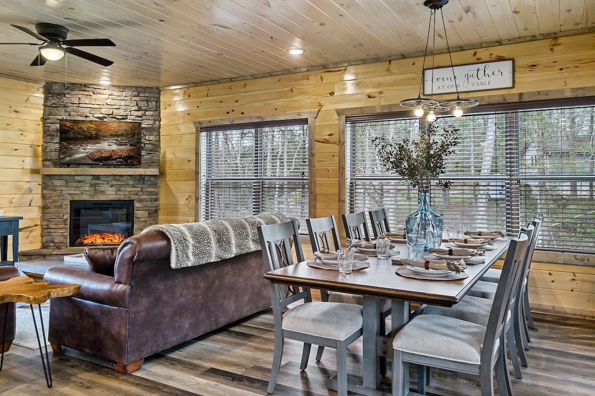 The living room sets the stage for cozy downtime with sleek hardwood floors, a stone electric fireplace, and plenty of comfy seating options for the whole group. Grab a book and cozy up next to the window, stream your favorite shows on the Smart TV, or plan for another exciting day in the Smoky Mountains.