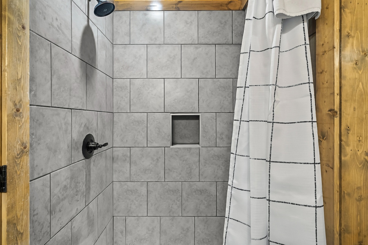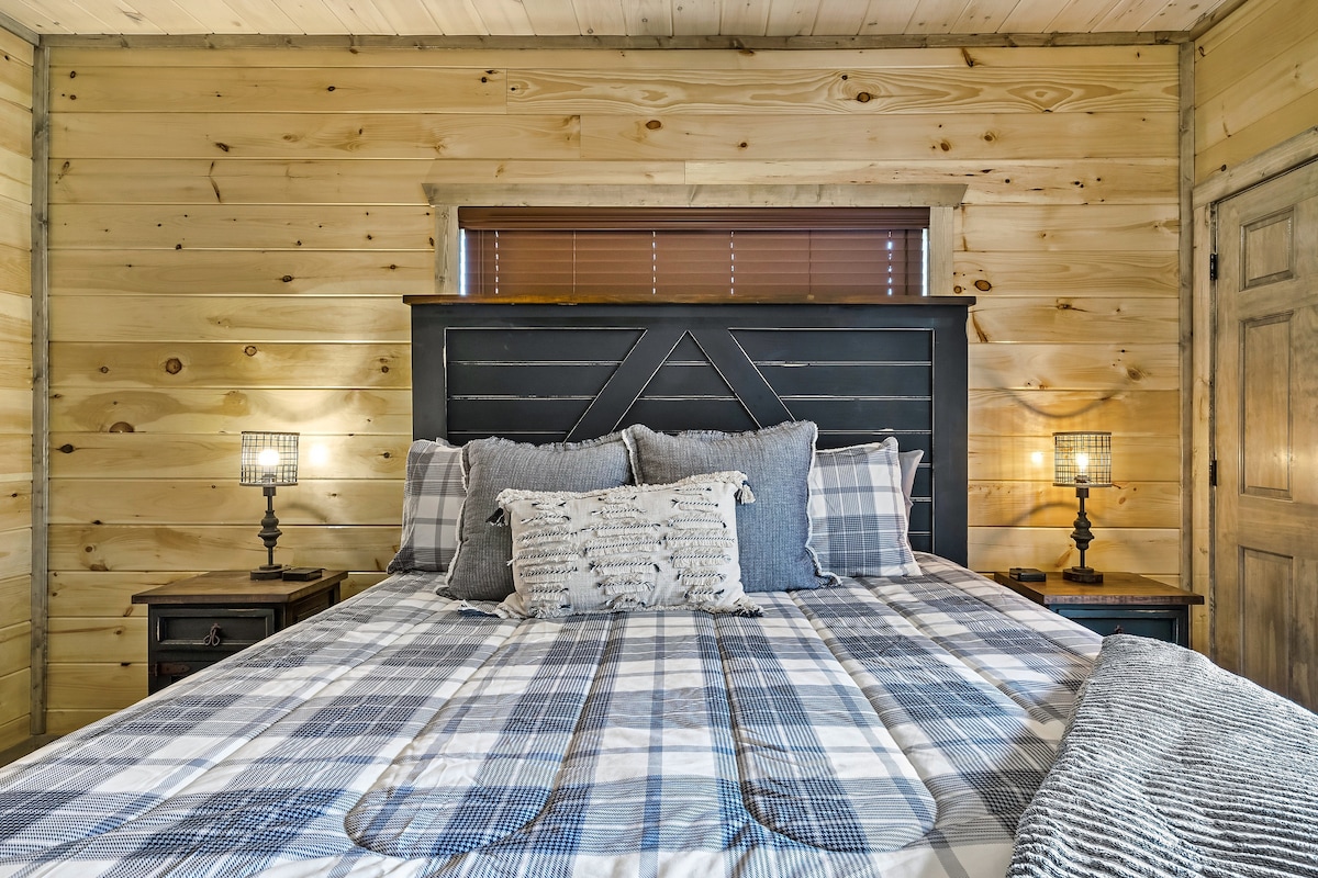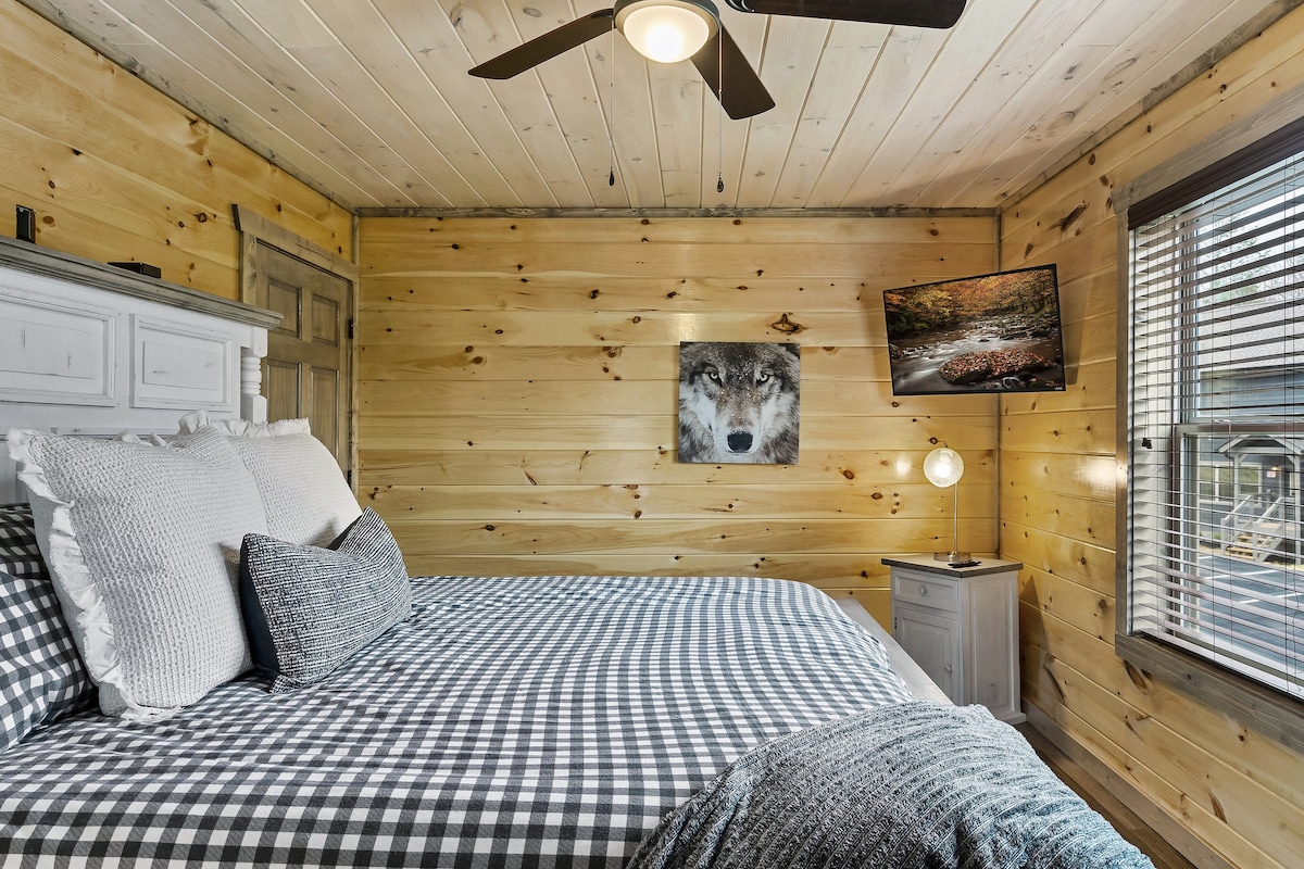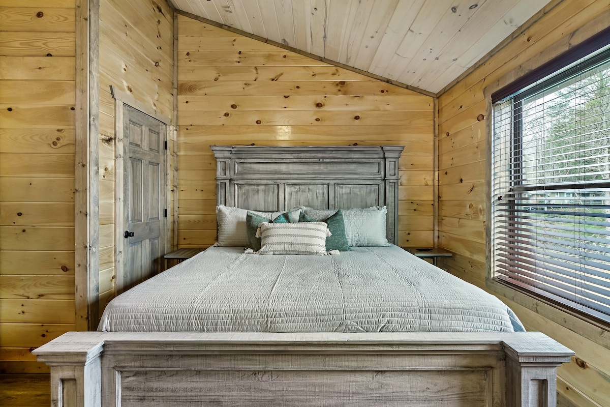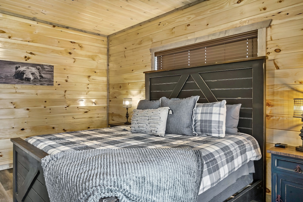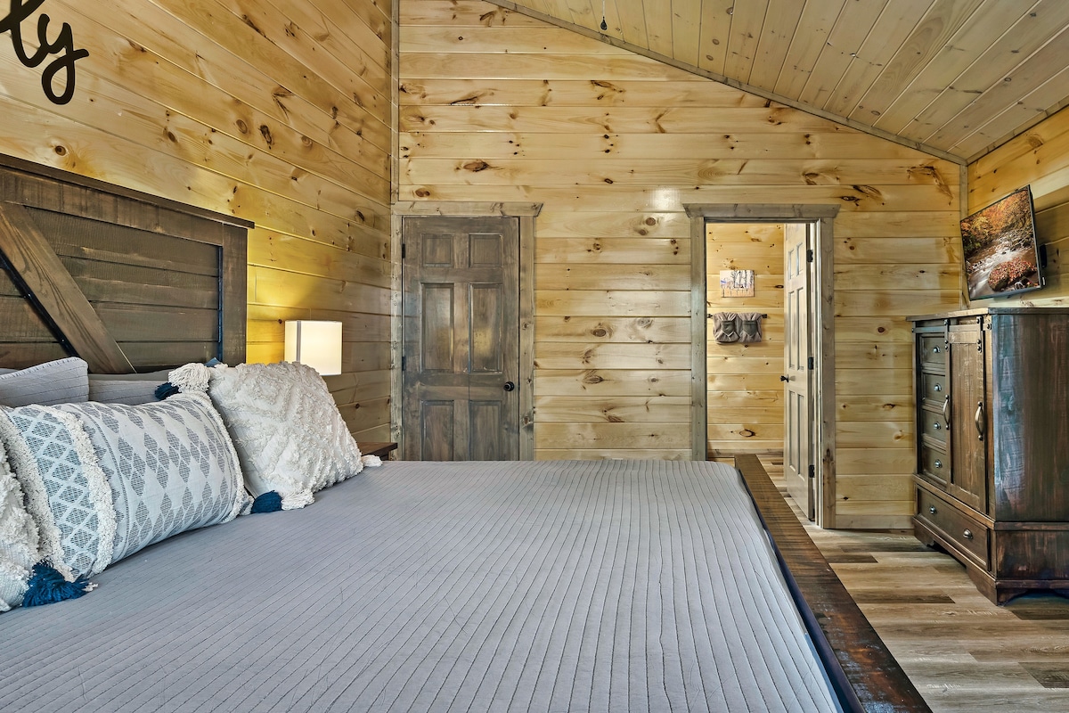 When you’re ready to wind down for the night, the cabin’s five spacious bedrooms are decorated with a natural theme to match the mountain views and furnished with luxurious amenities to make it a perfect place for resting after a day of exciting adventures in the Great Smoky Mountains. Each bedroom has a smart TV, dresser, and closet.