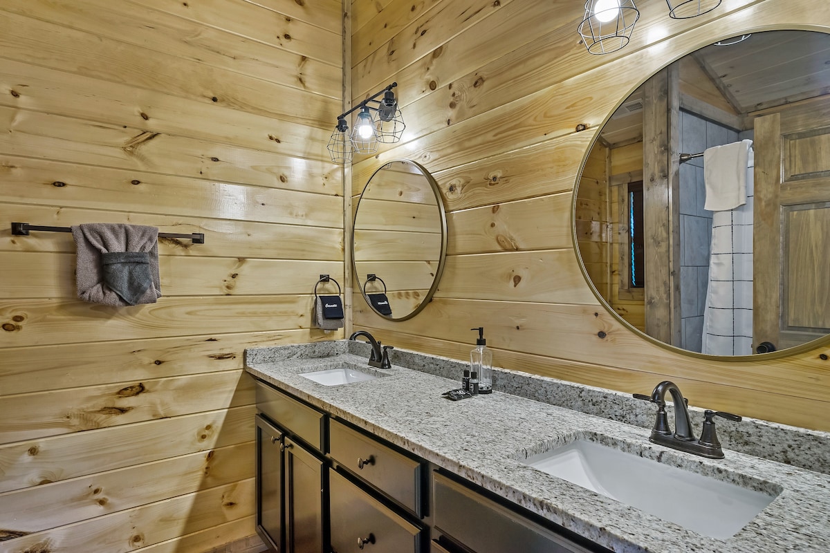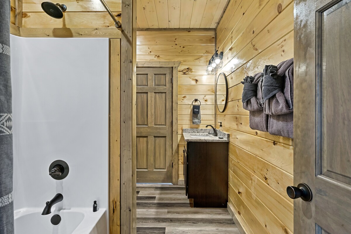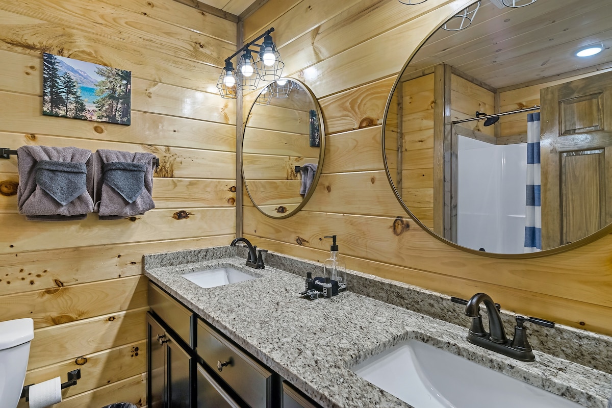 This charming cabin features five full bathrooms, all of which are stocked with essential toiletries and clean towels for maximum comfort and convenience.