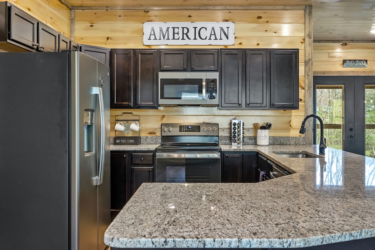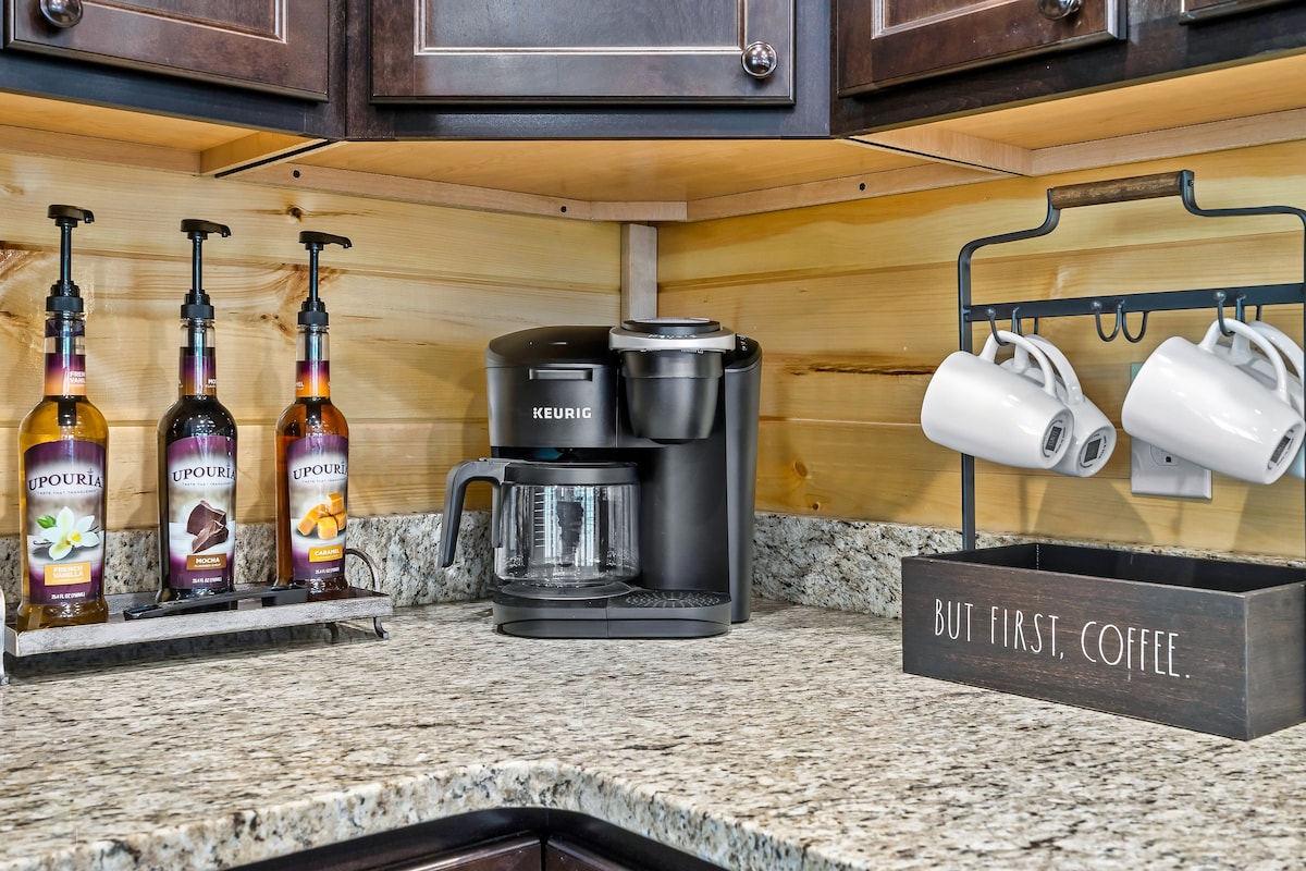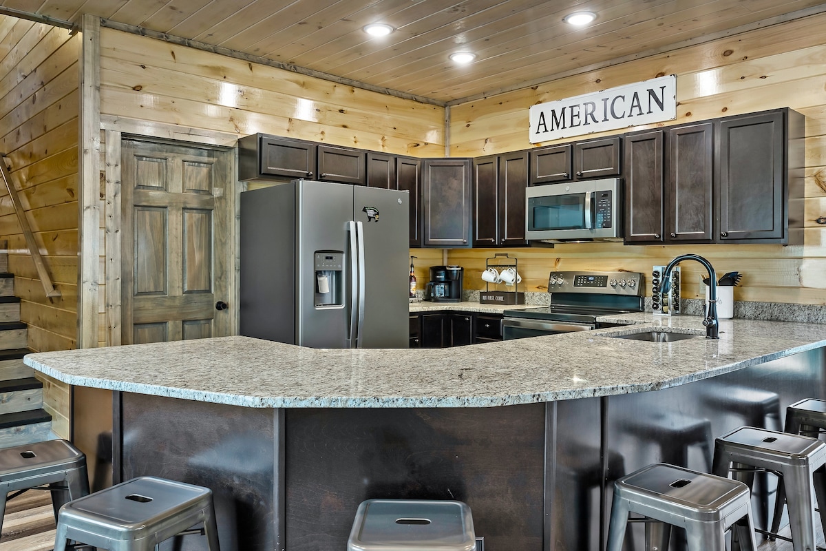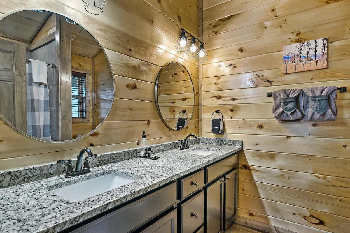 This charming cabin features five full bathrooms, all of which are stocked with essential toiletries and clean towels for maximum comfort and convenience.