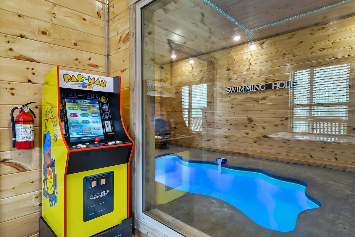 The downstairs game room is sure to be a hit with the whole family. Hours of entertainment await in this fun area, complete with a pool table, air hockey, an arcade game, a flat-screen smart TV, and LED lights. Those in the game room can keep an eye on the swimming pool thanks to a glass wall providing a view!